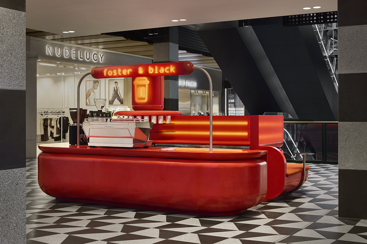 The brief was clear. As Hamish Collins of Bergman & Co. explains, “The brief was to create a bold coffee kiosk that stood out from the crowd. The café design was to be playful to cater for Melbourne Central’s primarily youthful demographic.” Positioned on a tenancy pad wedged between two imposing structural columns, the kiosk needed to perform efficiently within a constrained footprint while competing visually with its surrounding retail context. Collins notes that the project’s success lies in its ability to “catch the eye and draw customers in from the overwhelming shopping mall experience.”