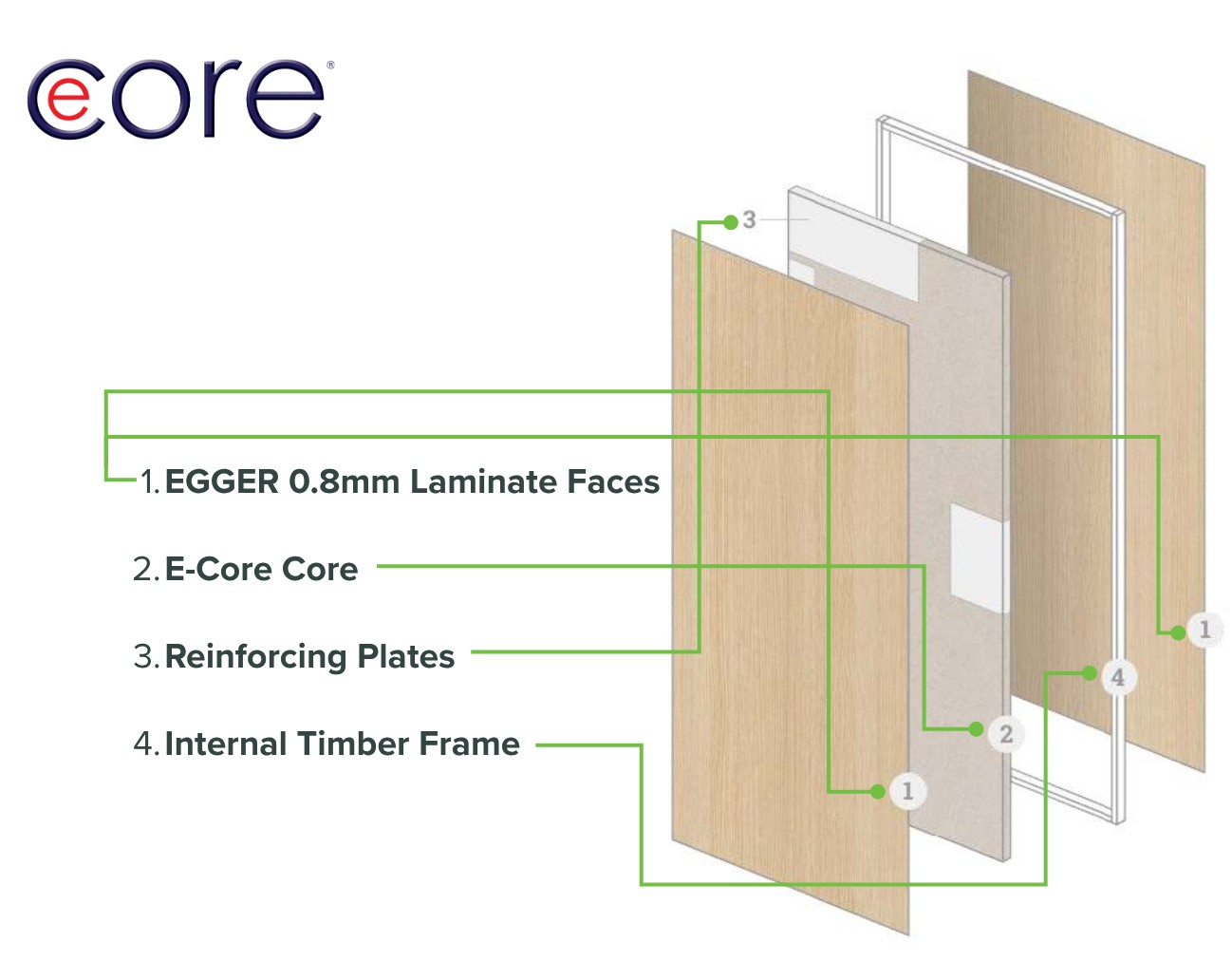 *Only EGGER Laminates supplied by ForestOne have been assessed and tested for use with E-Core door systems. ForestOne does not supply door cores or complete door sets.