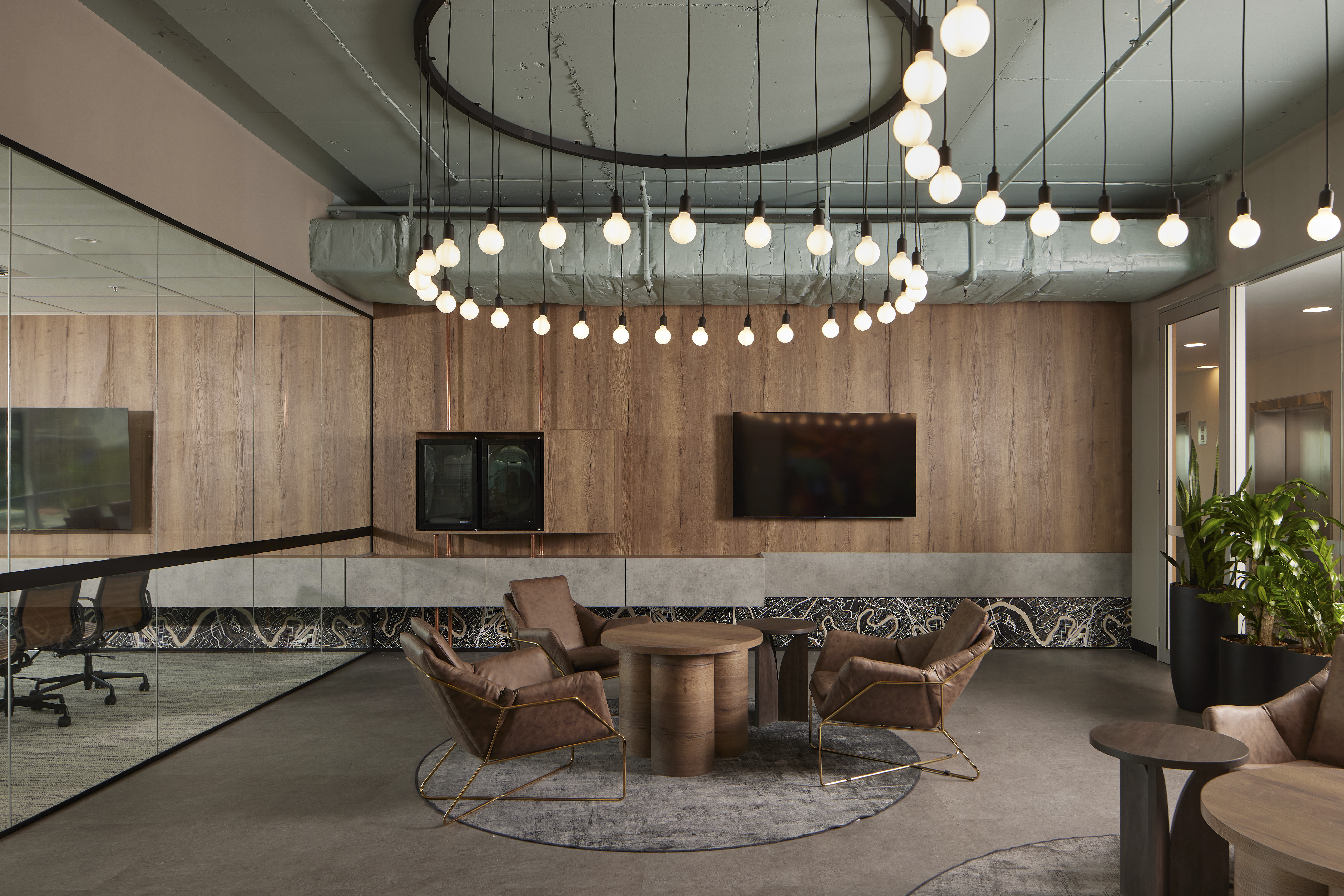 The design channels Brisbane’s creative spirit with greenery, light, and layered textures reflecting the energy of the Southbank precinct. Natural timber tones and plenty of greenery bring the outdoors in, while rock gardens and geometric lighting echo the river below. The area’s industrial history is referenced in polished-concrete desks, tabletops and planter boxes, as well as gleaming copper accents on furniture. A striking mural of Brisbane greets visitors, softening the industrial textures and immediately grounding the design in its sense of place.