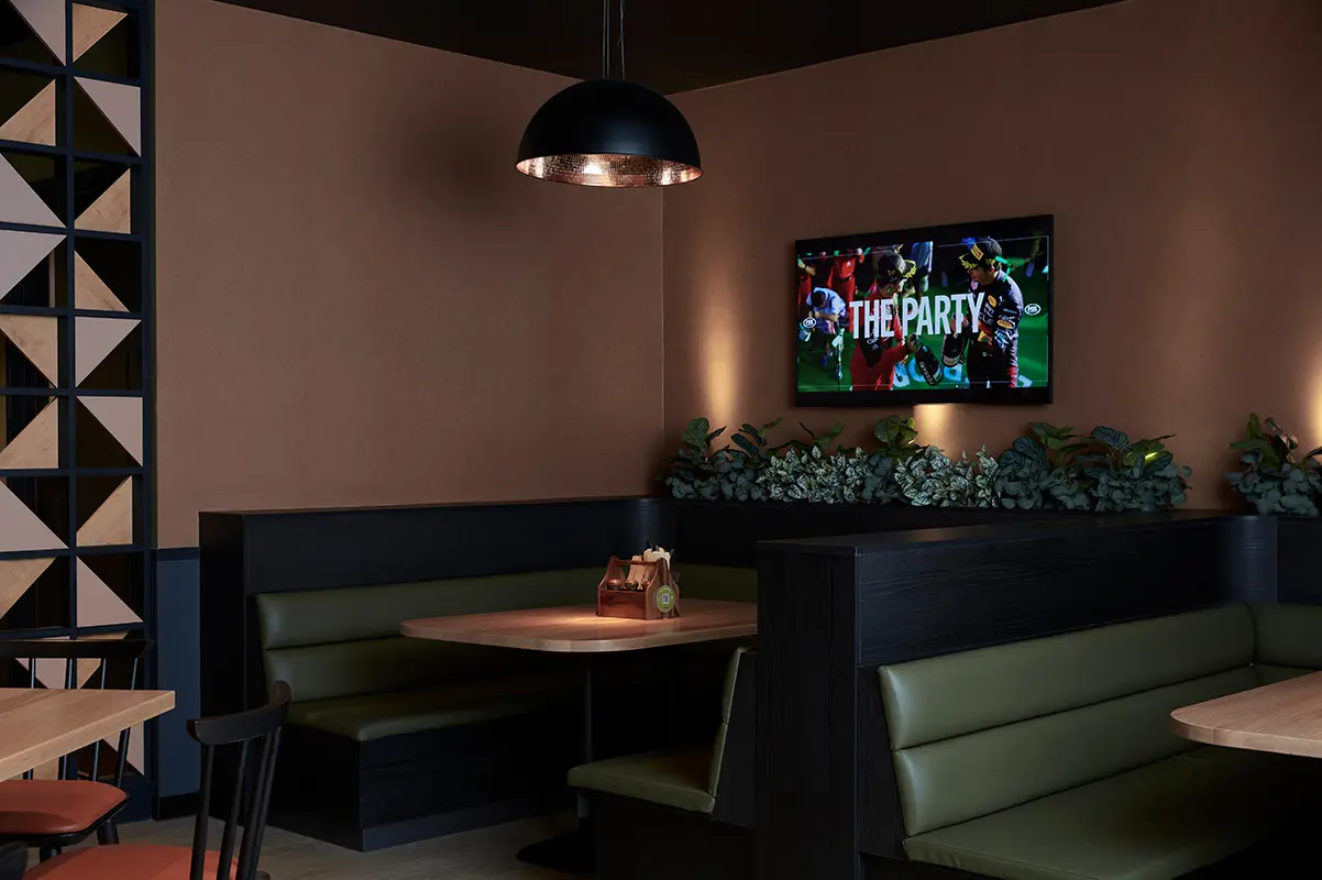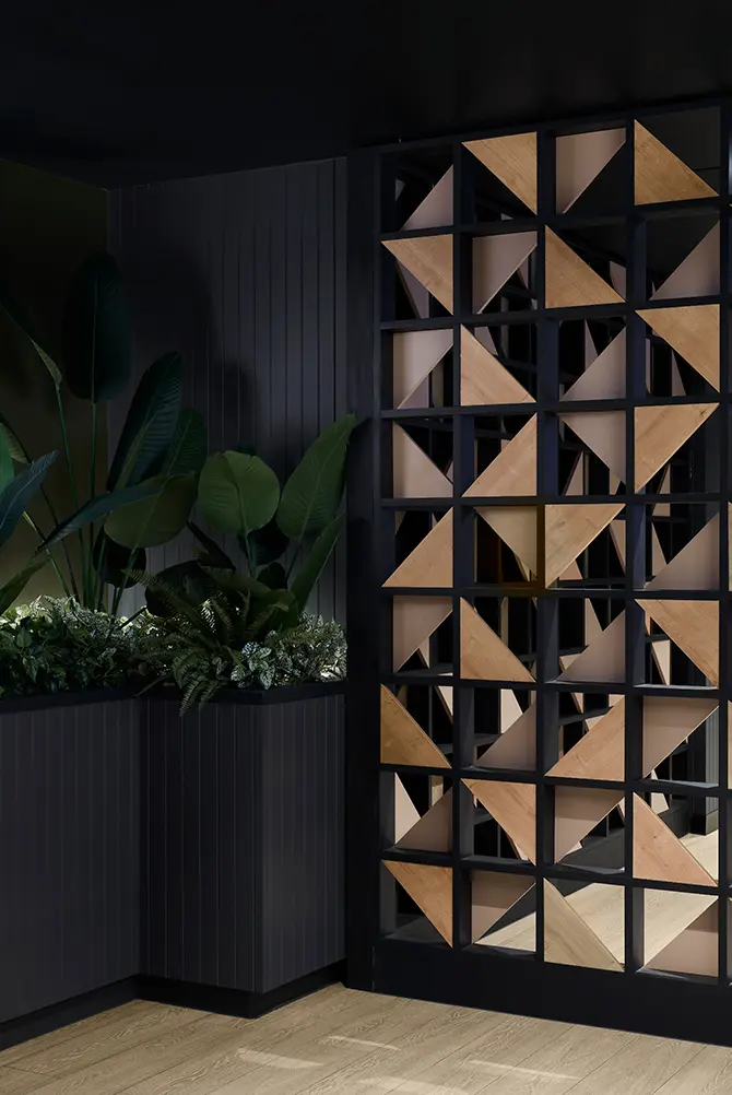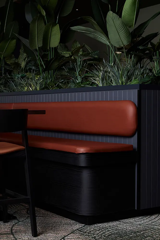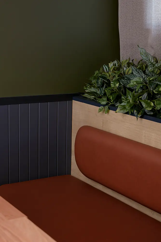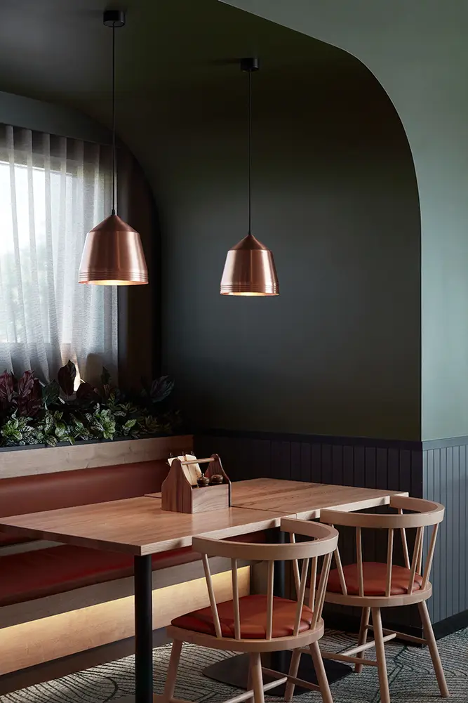 Combining durability and attractiveness, the EGGER laminates are an ideal material choice for projects such as Parkwood Tavern. Providing hygienic and food safety advantages, as well as being wear, impact and scratch-resistant, EGGER laminates are made from 60 per cent renewable materials – further providing a safe and sustainable material for the tavern. Additionally, with the introduction of an indoor-outdoor connection for the diverse demographic, Cayas and Ward incorporated “a splash of forest green” to enhance both the interior entertainment rooms and outside areas. Soft timber tones, subtle textures, and warm hues bring an inviting sense of comfort echoing the tavern’s role as a local meeting place. This is complemented by “Apricot Nude, [which] works perfectly with our colour palette,” and for feature screens, Cayas and Ward used Natural Hamilton Oak along with black timber frames.
