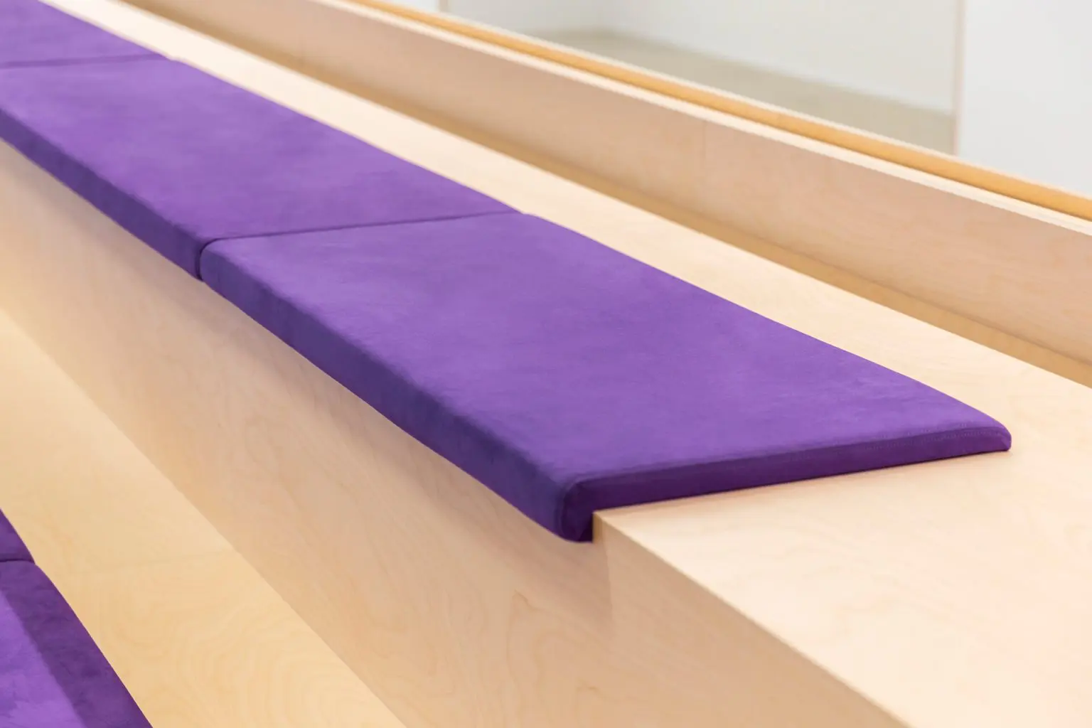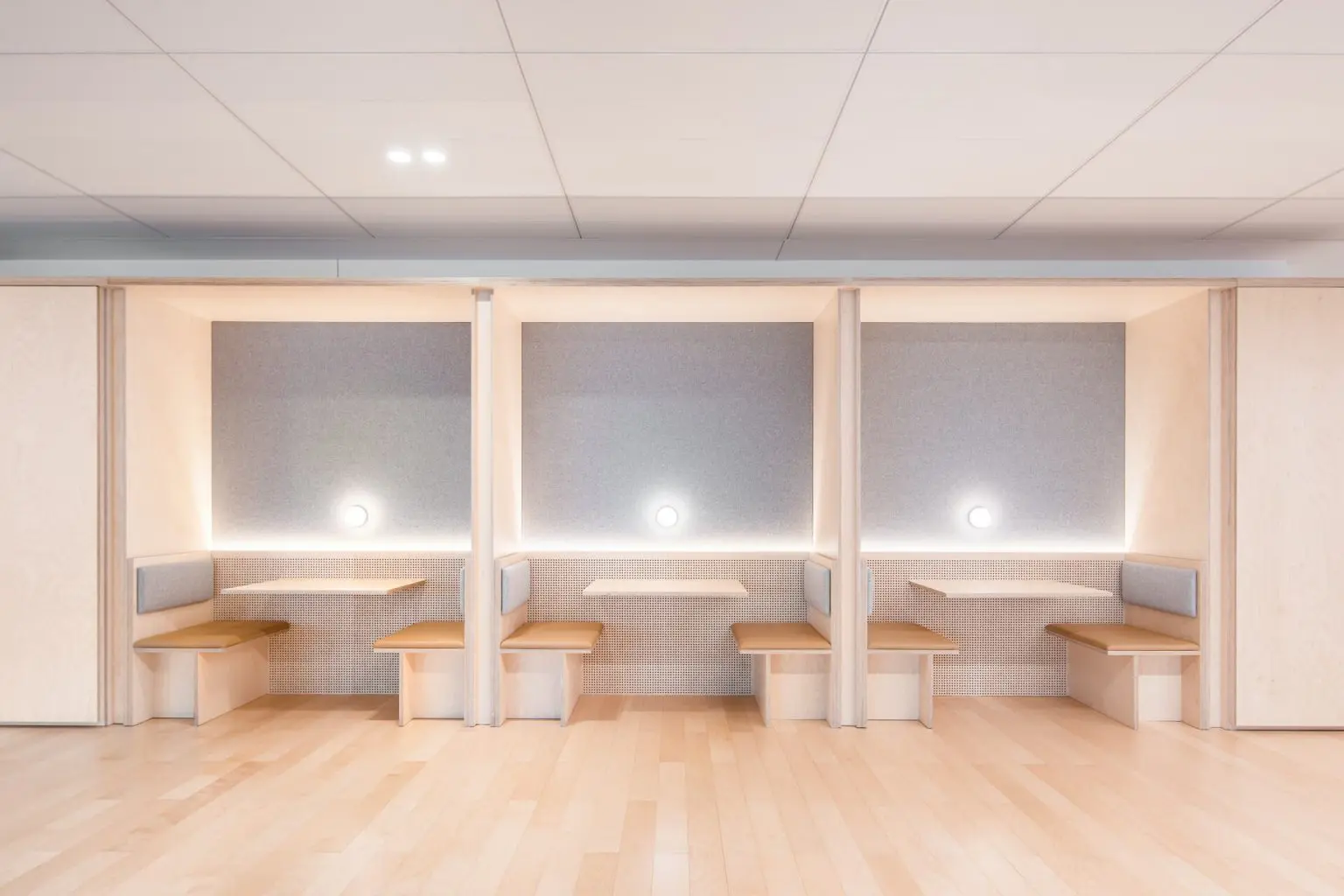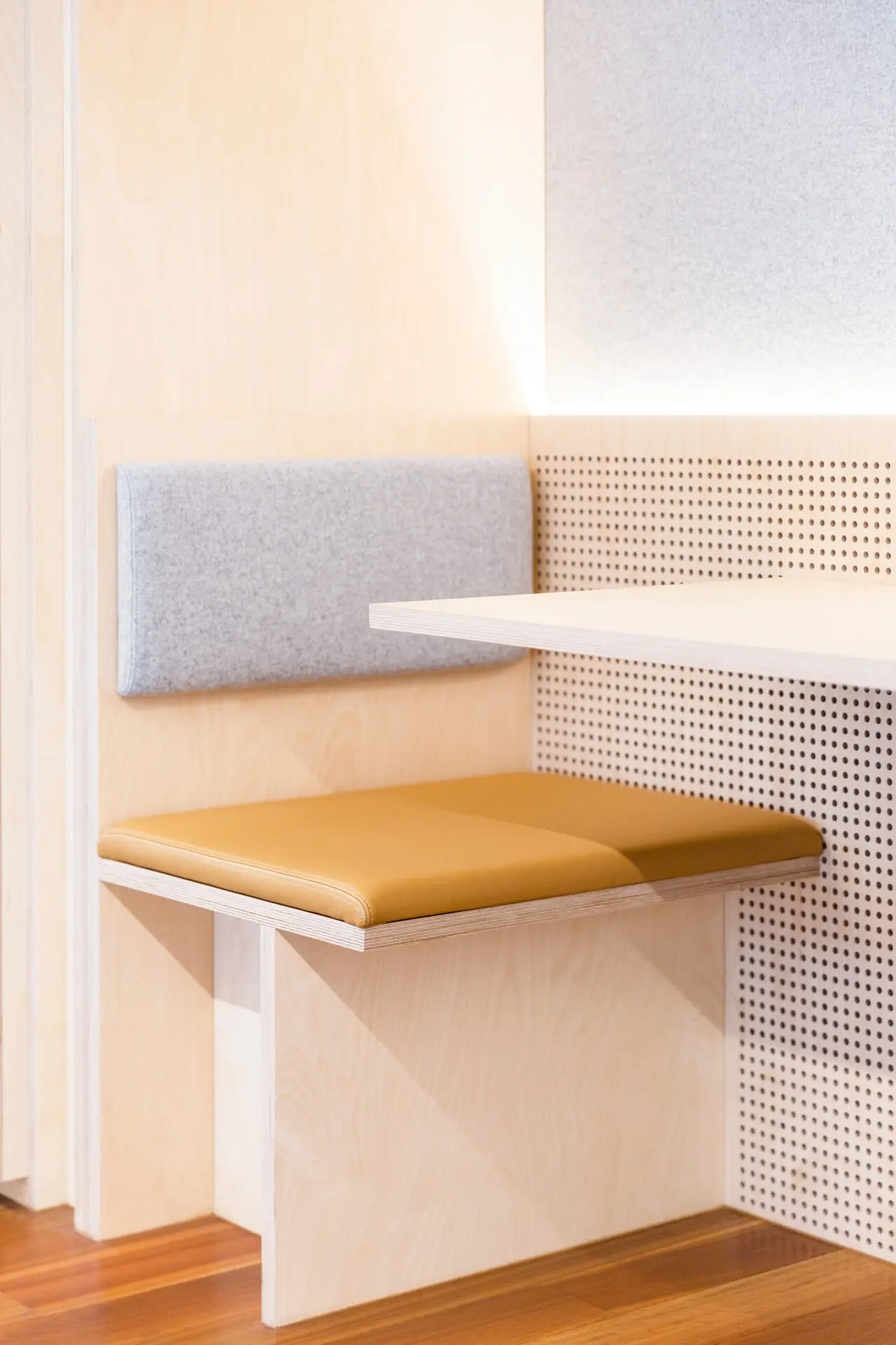 To bolster employees’ wellbeing, Hassell Studio used DesignerPly Birch clear powder-coated panels throughout the interior space, creating a warm environment that enhances workflow. As a non-structural plywood, Birch clear powder-coated panelling was selected for its durability, refined finish, and suitability for semi-exposed commercial environments. Aside from supplying an aesthetic finish, the plywood conveys a soft and calming appeal within communal workspaces, conference rooms, eateries, multi-faith rooms, parent rooms and large studios. Paired with plant life and coloured lounges, the chosen material offers a cheerful reprieve from the monochromatic background of Melbourne.